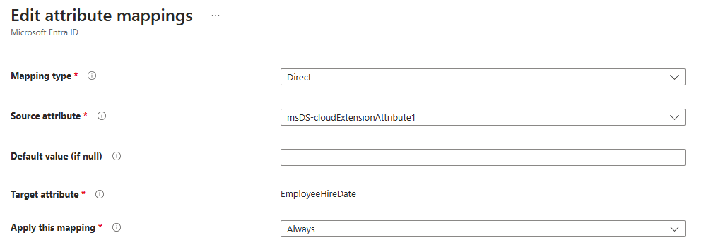 Because the users are going to been synced from Active Directory, the “EmployeeHireDate” field in Entra ID is not going to get managed from Entra ID. And since this field does not exist in Active Directory, we have to make a custom mapping first.