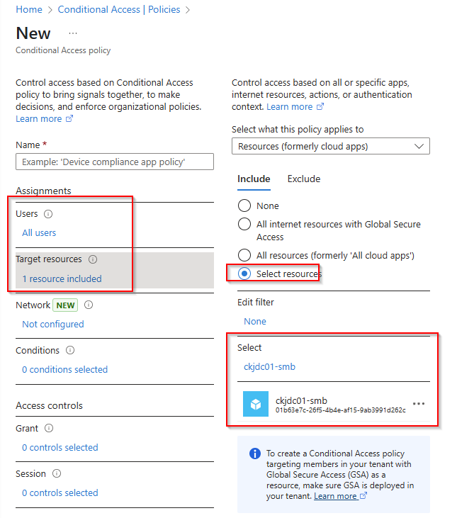 In the picture below, you can see that I have selected all users and then under target resources, I have selected my enterprise application that was created in the Global Secure Access configuration.