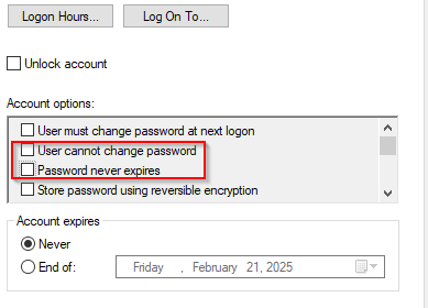 Remember to ensure that users can change their own password and that their password expires in Active Directory Users and Computers (OBS: do not remove the checkmark in “password never expire” without letting the users reset their password first, otherwise users will be locked out and can only regain acces by having an administrator reset their password)